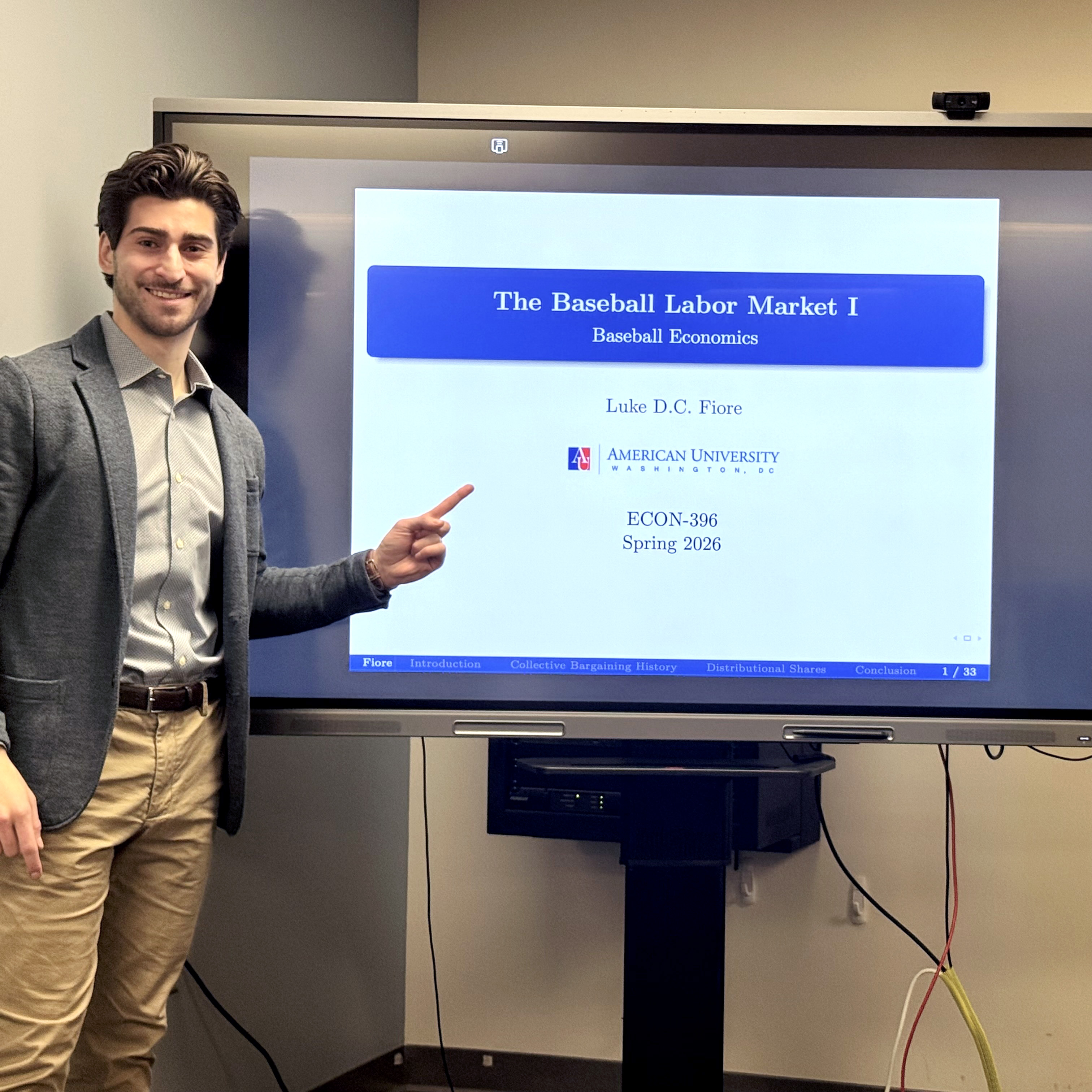 When AU’s Department of Economics developed its Student-Designed Course Competition, an initiative inviting students to develop courses based on their interests, Fiore saw an opportunity. After working as a teaching assistant for a Taylor Swift–themed economics class, he began shaping his own idea: a course that would use baseball to explore complex economic concepts.