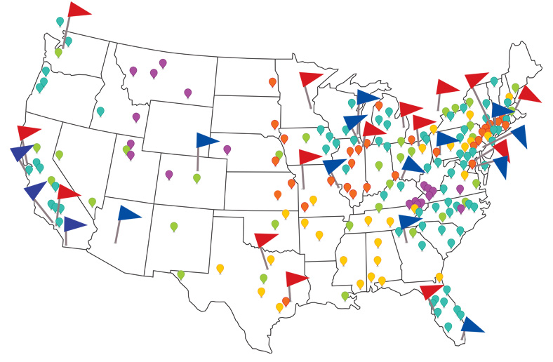 The ballparks Tim Titus has visited. American League stadiums are represented by red flags, National League ones by blue. Dots represent the various