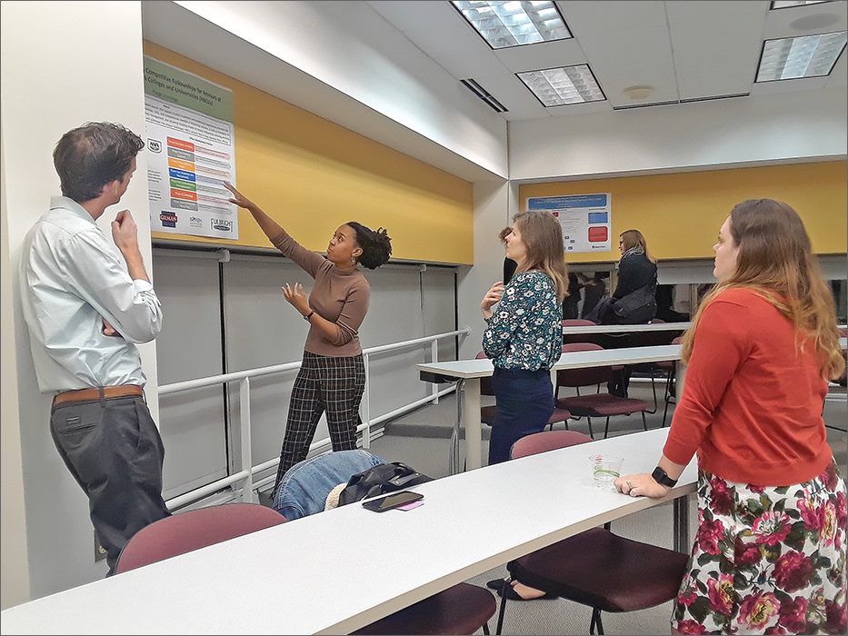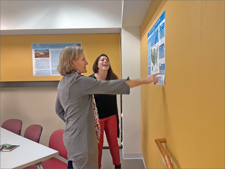 ITEP Professor Cynthia Miller-Idriss critiques a student's poster presentation.